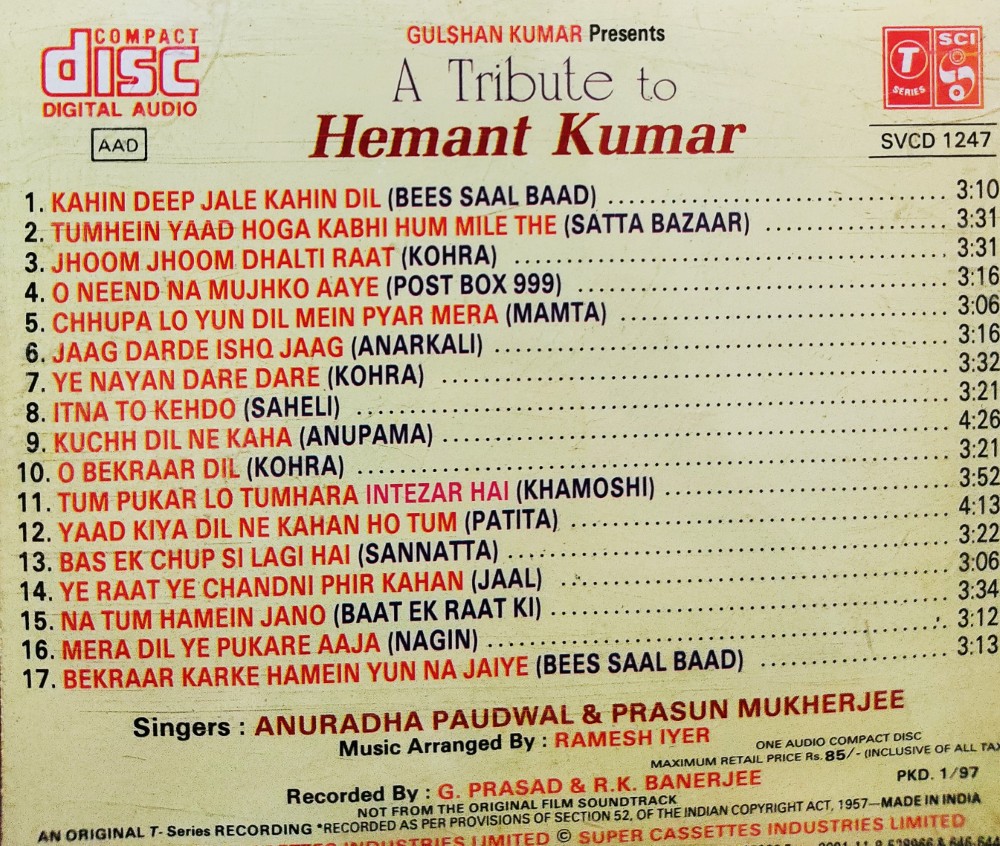 | Title | : | A Tribute to Hemant Kumar by Anuradha Paudwal & Prasun Mukherji |