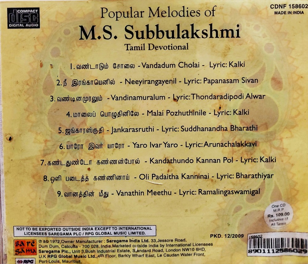 | Title | : | Popular Melodies of MS Subbulakshmi – Tamil Devotional |