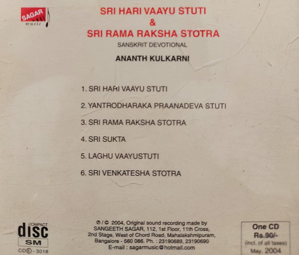 | Title | : | Sri Hari Vaayu Stuti/Sri Rama Raksha Stotra : Ananth Kulkarni |