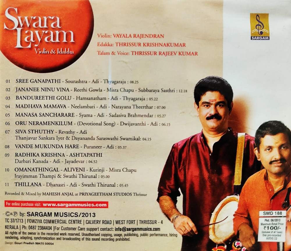 Title : Swara Layam : Violin & Idakka – Thrissur Krishna Kumar & Vayala Rajendran