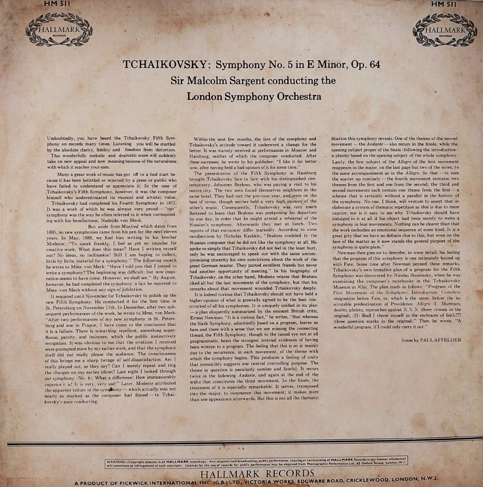 Record Title : Tchaikovsky Symphony No.5 – Sir Malcolm Sergent Conducting London Symphony Orchestra